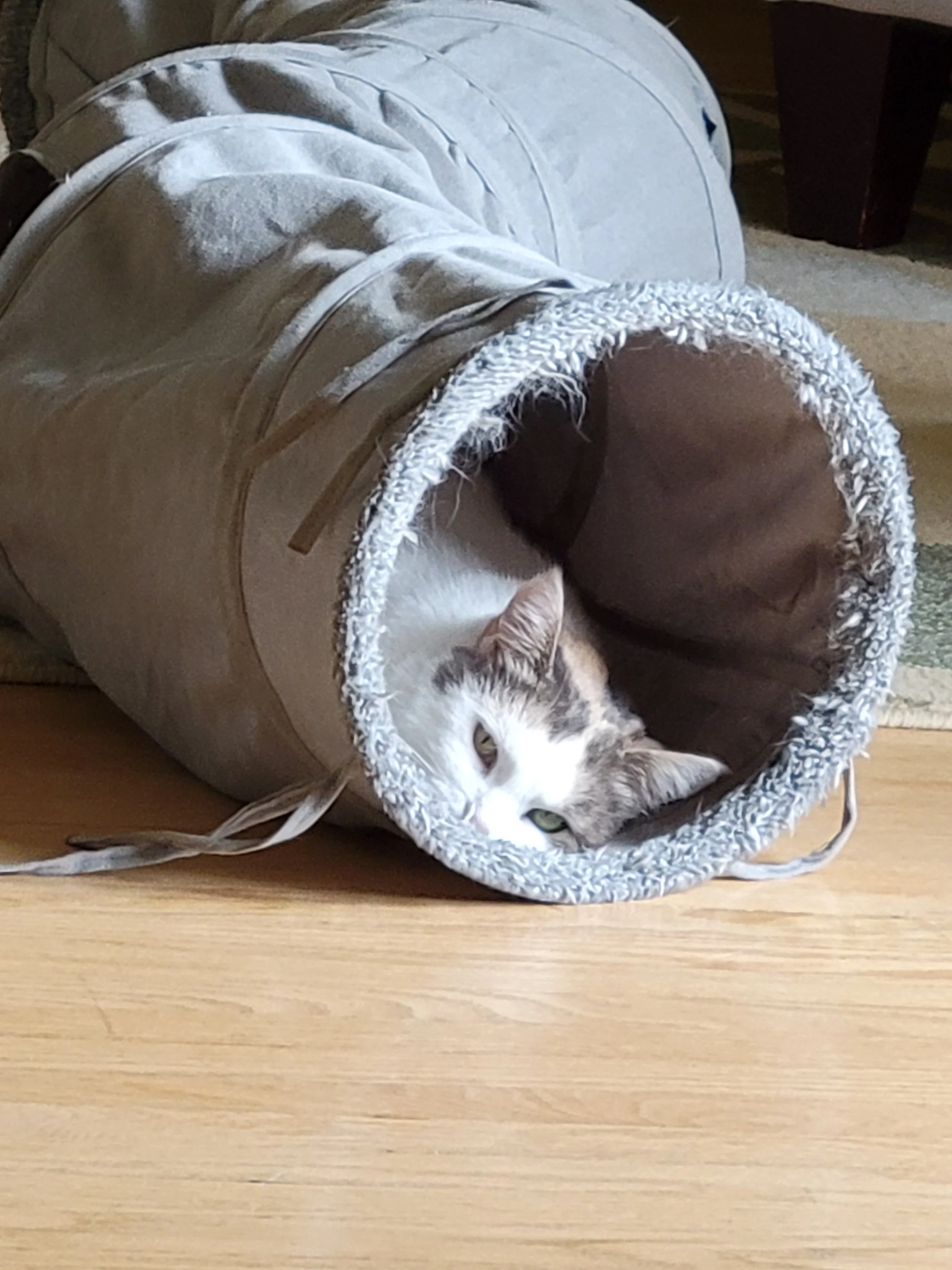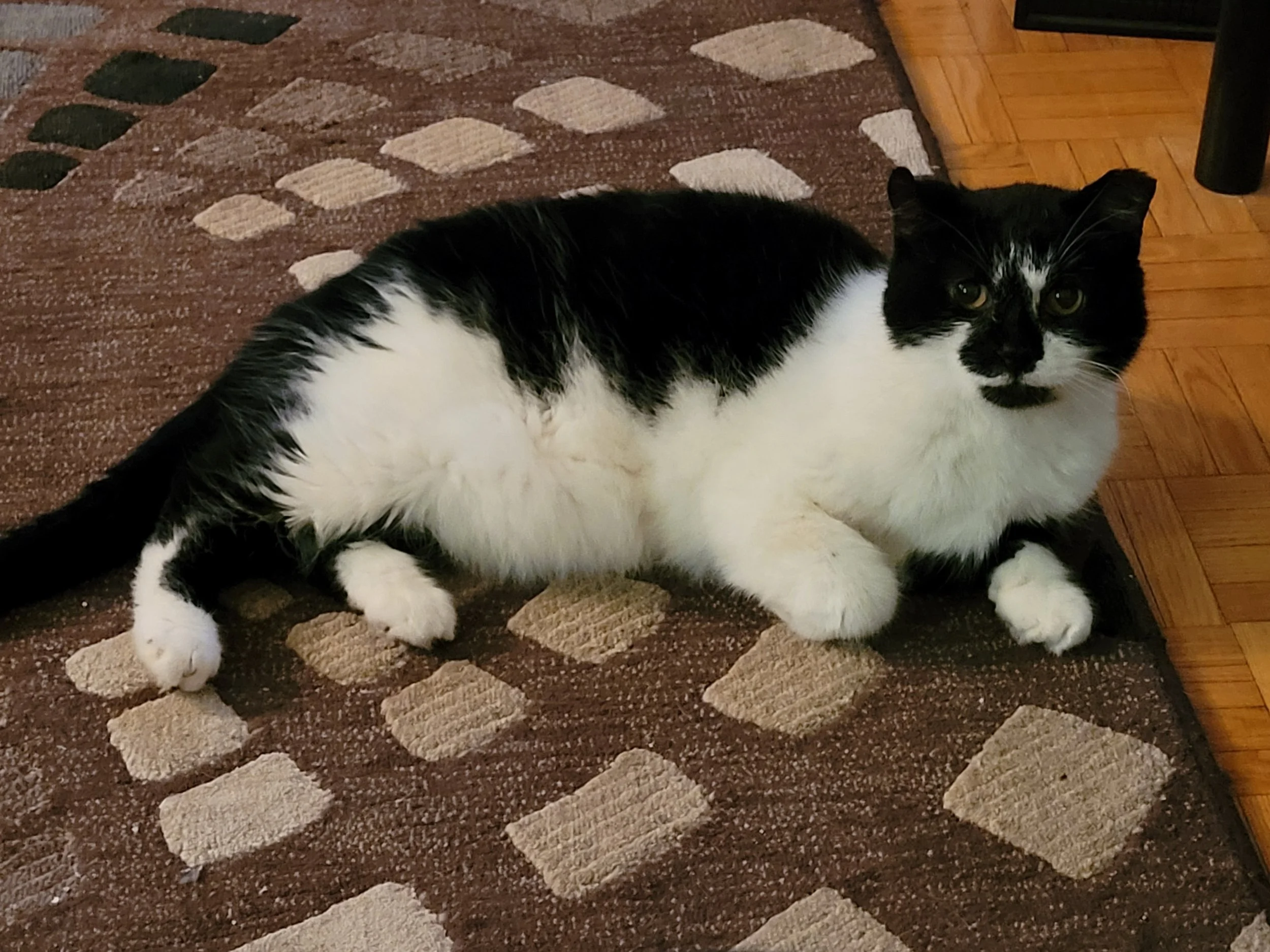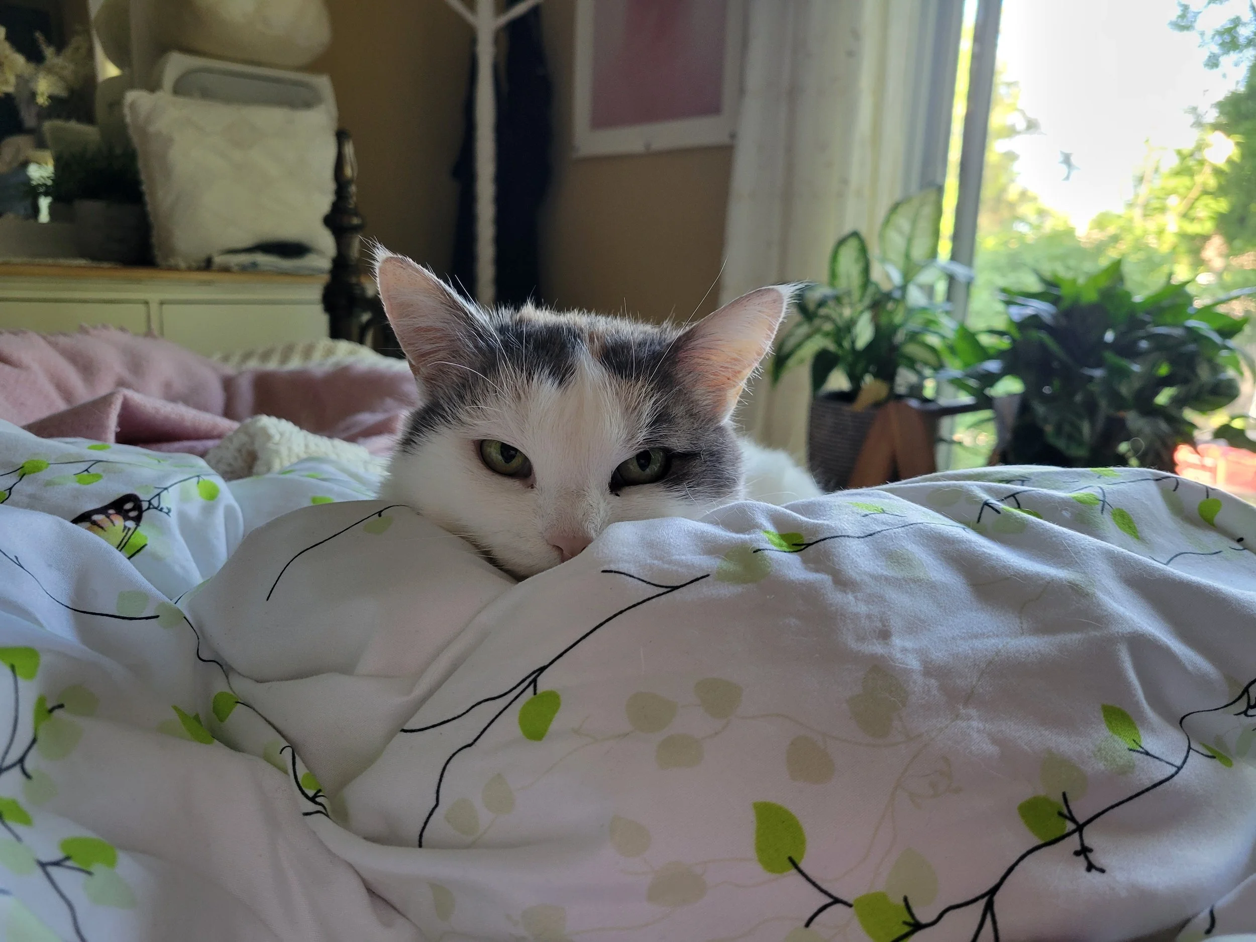 He loved to curl up and sleep on his blanket on the couch. He was a loving cat who sat at Stephanie's feet purring while she had her morning coffee every day. He passed away in March 2024. He will be in her heart forever.