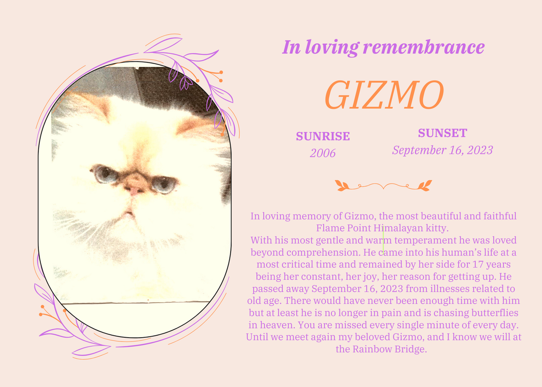 With his most gentle and warm temperament he was loved beyond comprehension. He came into his human’s life at a most critical time and remained by her side for 17 years being her constant, her joy, her reason for getting up. He passed away on September 16th, 2023 from illnesses related to old age. There would have never been enough time with him but at lease he is no longer in pain and is chasing butterflies in heaven. You are missed every single minute of every day. Until we meet again my beloved Gizmo, and I know we will at the Rainbow Bridge.