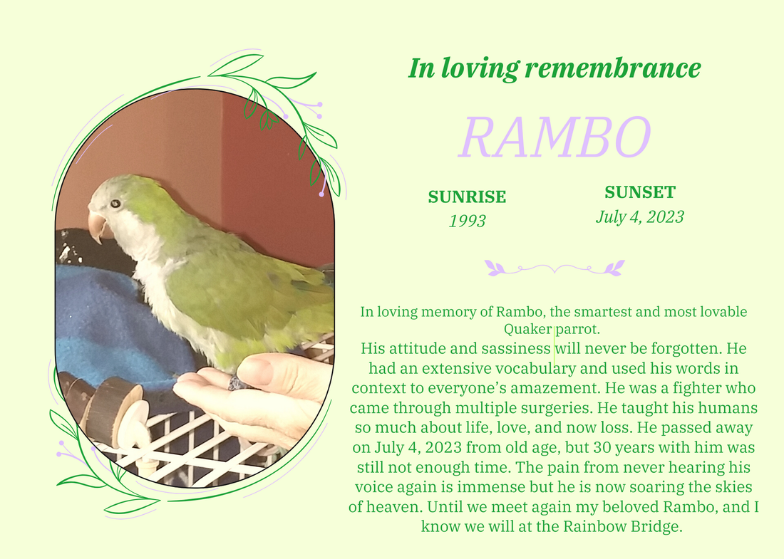 His attitude and sassiness will never be forgotten. He has an extensive vocabulary and used his words in context to everyone’s amazement. He was a fighter who came through multiple surgeries. He taught his humans so much about life, love, and now loss. He passed away on July 4, 2023 from old age, but 30 years with him was still not enough time. The pain from never hearing his voice again is immense but he is now soaring the skies of heaven. Until we meet again my beloved Rambo, and I know we will at the Rainbow Bridge.